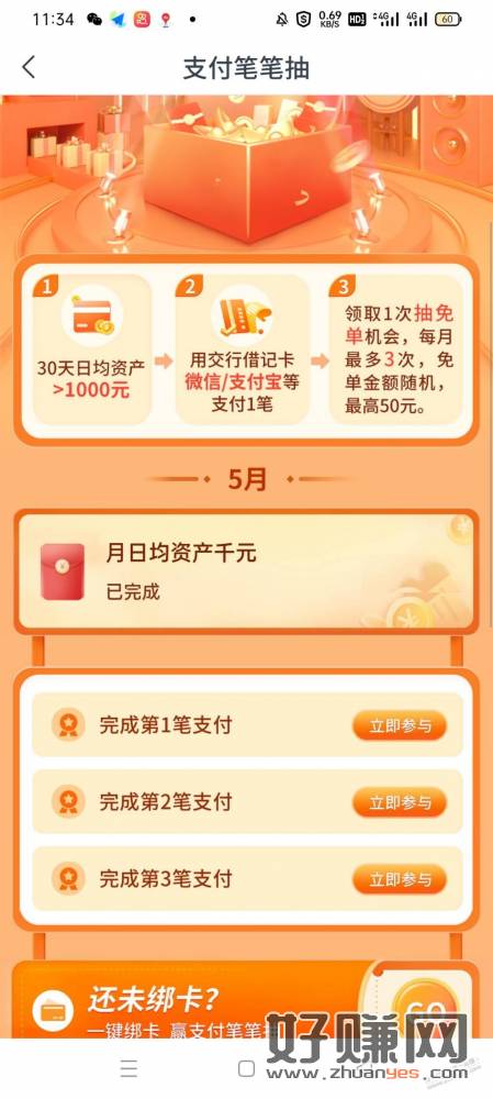 交通银行APP,活动中心,瓜分300万,支付支付笔笔抽,主要需要日均资产千元,小任务好完成往支付宝微信转账1元就可以。