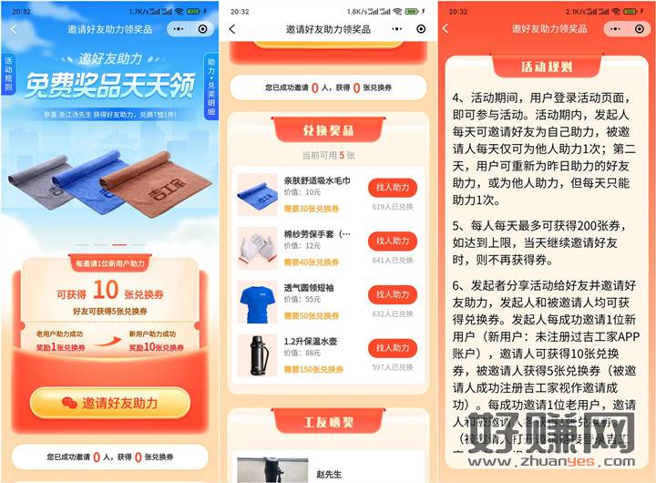 吉工家邀好友助力0撸毛巾、短袖、水壶等