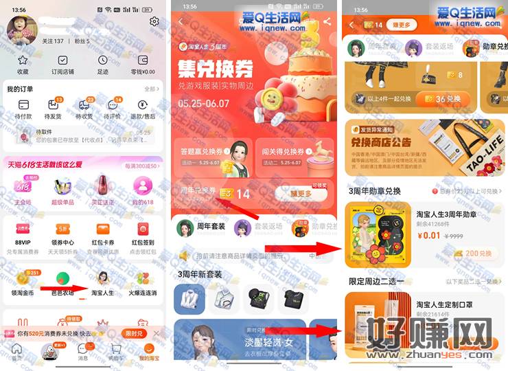 淘宝APP-我的-淘宝人生-去完成页面上的任务攒兑换券 获得0.01元购实物资格