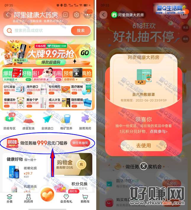 淘宝APP-搜索【阿里健康大药房】-进店-首页中间【做任务抽999元无门槛券】-完成任务抽奖