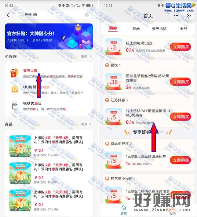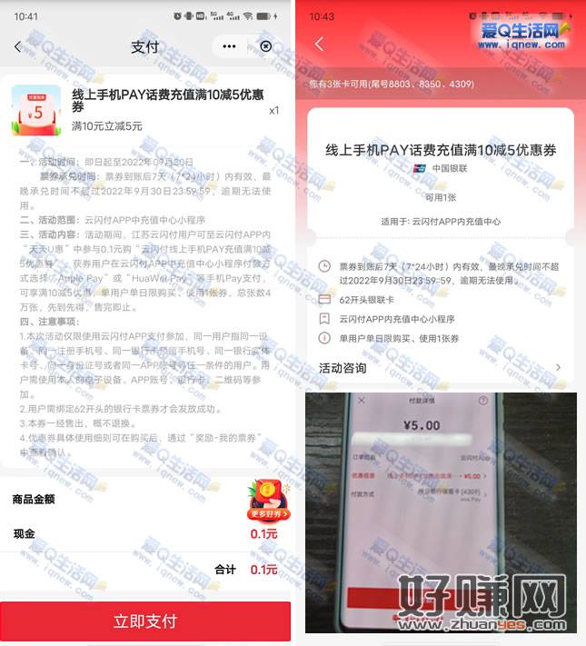 云闪付APP-搜索【天天U惠】-下拉至【江苏好券】-线上手机PAY话费充值满10减5元,0.1元购买