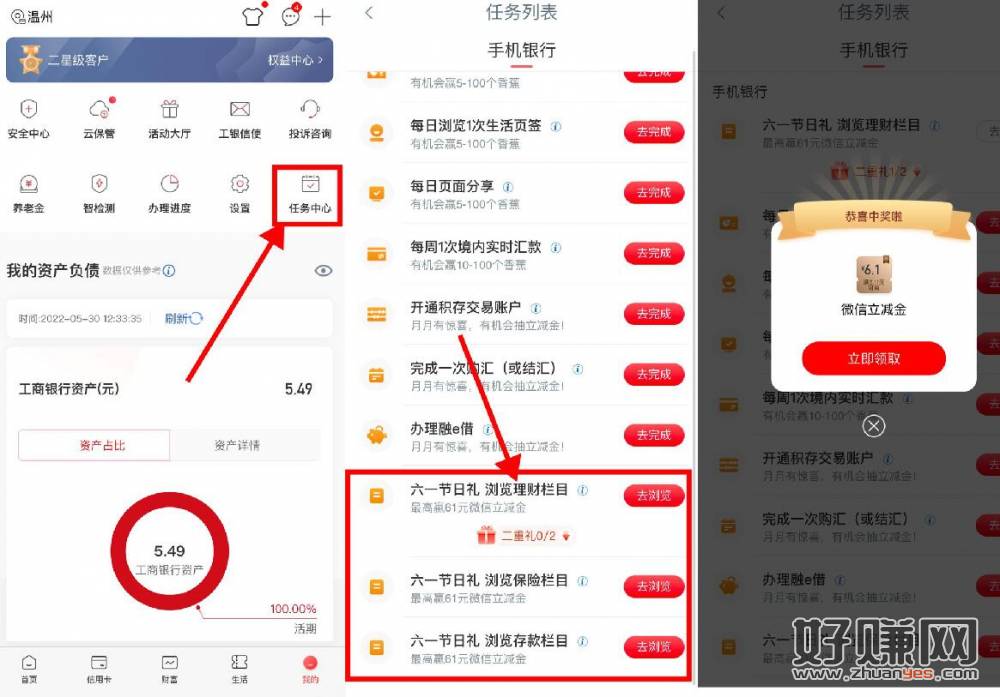 【工行六一节日礼抽6.1元立减金】工商银行APP->我的->任务中心->查看更多->完成浏览任务->抽6.1元立减金