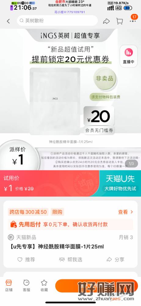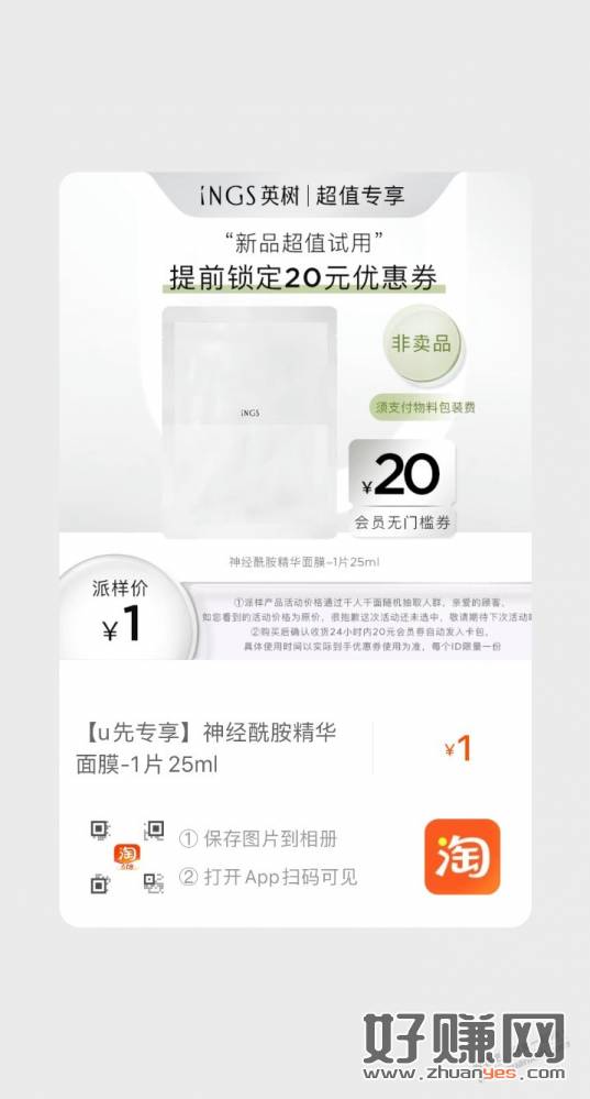 【u先专享】神经酰胺精华面膜-1片25ml」