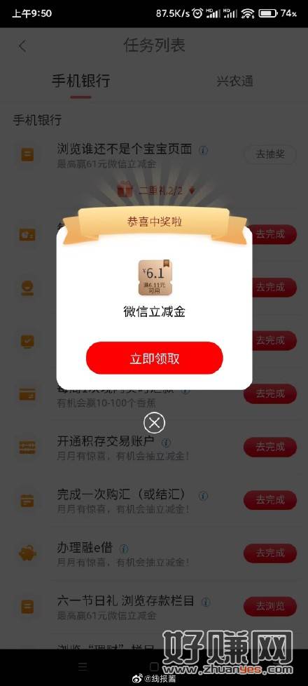 工行app→我的→任务中心→浏览得立减金,有多个活动