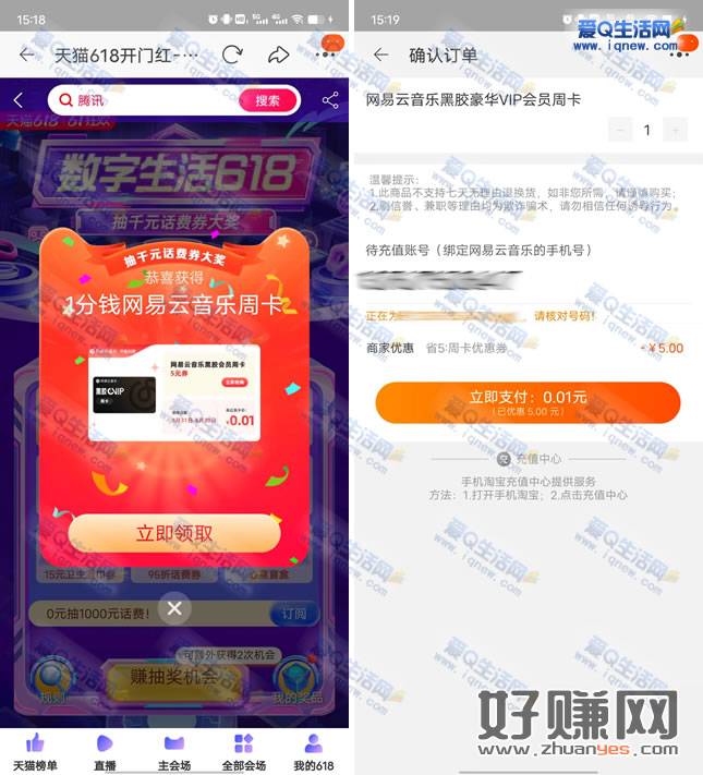 亲测抽中0.01元购网易云周卡,支付0.01元充值秒到