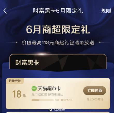 支付宝app-我的-支付宝会员-点钻石会员-下拉如果有财富会员黑卡,可领18猫超卡
