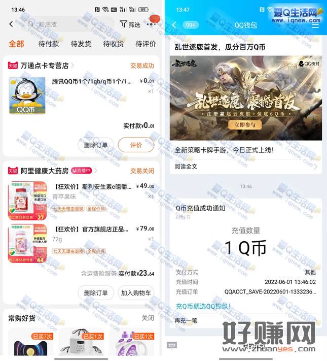 淘宝扫码下方二维码 支付0.01元 购买1Q币