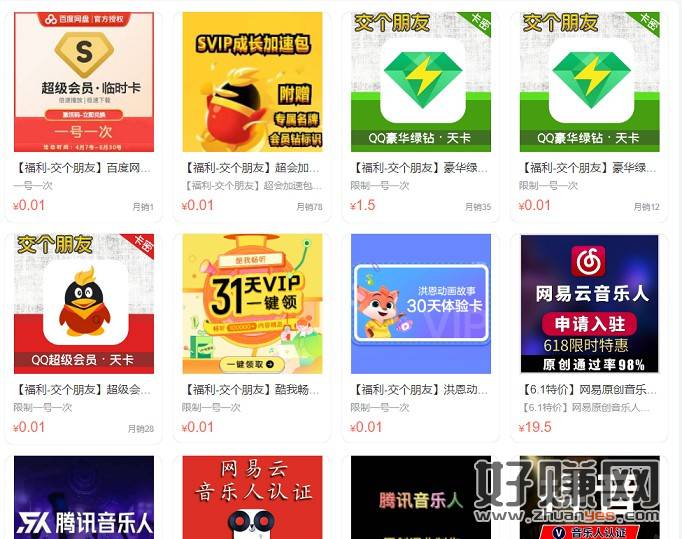 超会加速包31天=0.01、QQ豪华绿钻3天=0.01、QQ超级会员4天=0.01、QQ豪华绿钻31天=1.5、网易云黑胶年卡=45、饿了么年卡=22、优酷黄金年卡=35、抖音粉丝1000个=22