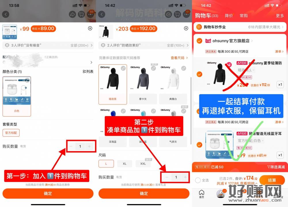 如图所示,两个商品都加入购物车后,再一起下单提交订单付款,再去单独退掉衣服,保留耳机就成立了!