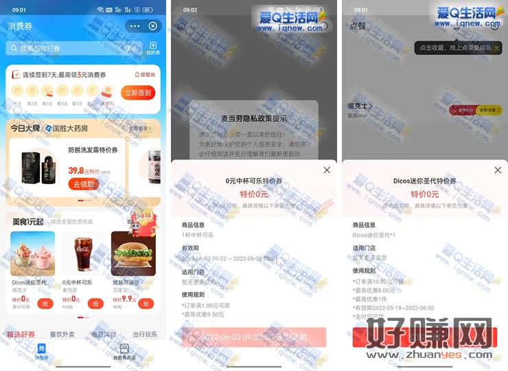 支付宝免费领德克士迷你圣代+麦当劳中杯可乐 需要随单