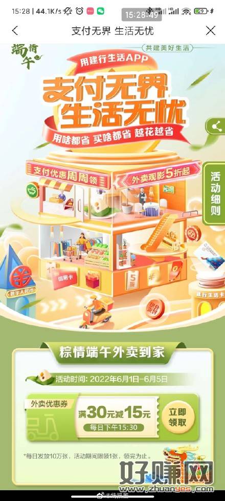 15点30,建行生活,端午有30-15外卖