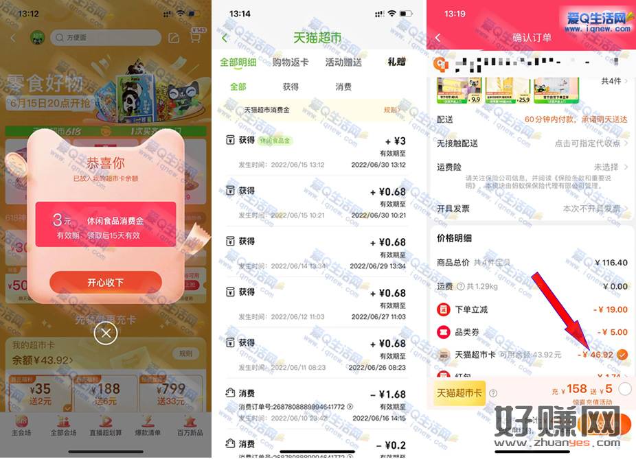 淘宝扫码进入活动页面会自动弹出消费金-再去天猫超市购买休闲食品-小编是买了一些洗面奶再加上一包辣条,付款的时候可以看到原来只有43.92元猫超卡但是扣除的是46.92,里面包含了3元消费金