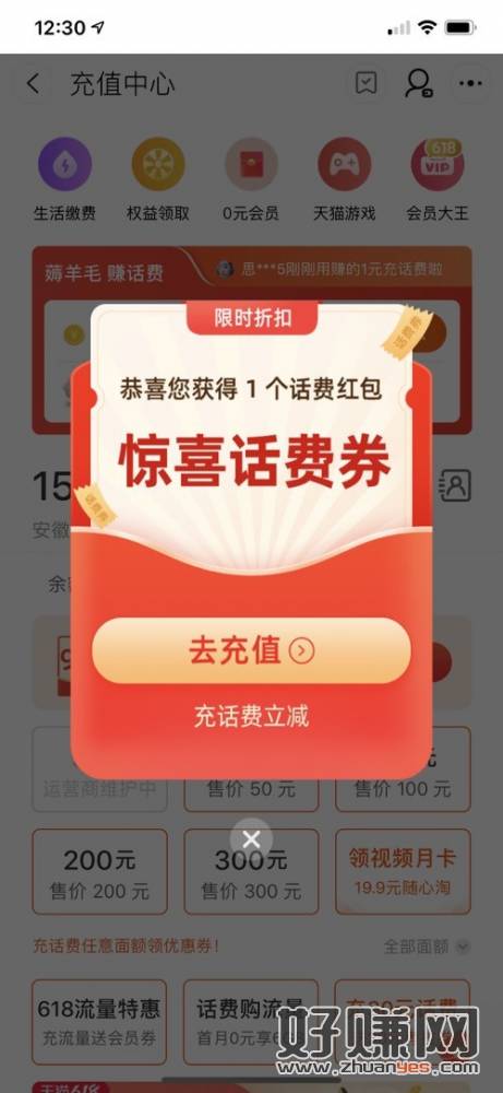 淘宝首页充值中心进去弹窗惊喜话费券充2
