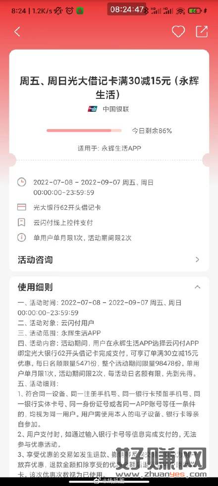 每周五周日,永辉生活,云闪付光大储蓄卡有30-15,月2