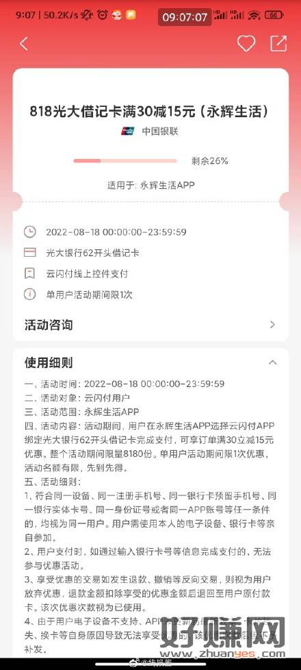 永辉生活买30用云闪付绑定光大卡,有30-15,可在微信
