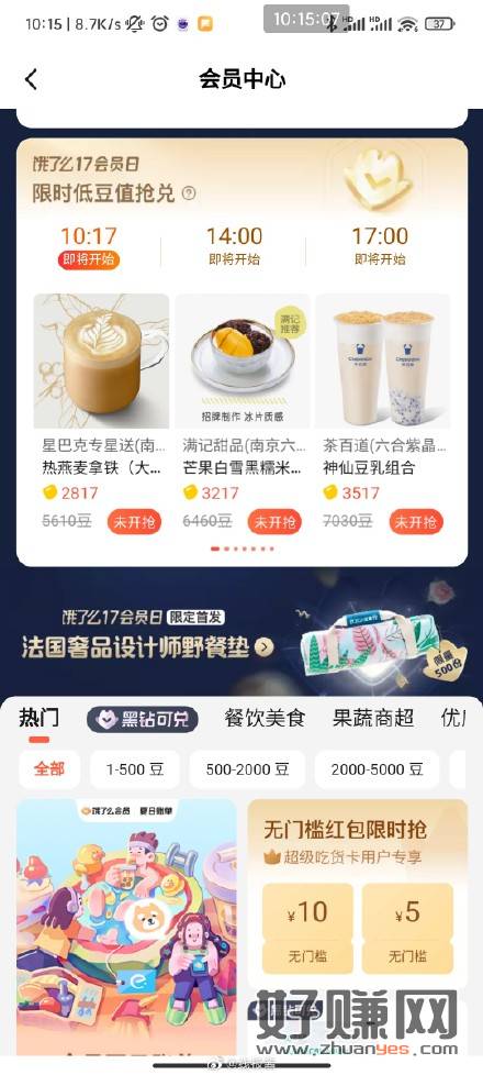 10:17/14:00/17:00 饿了么吃货豆兑换咖啡奶茶