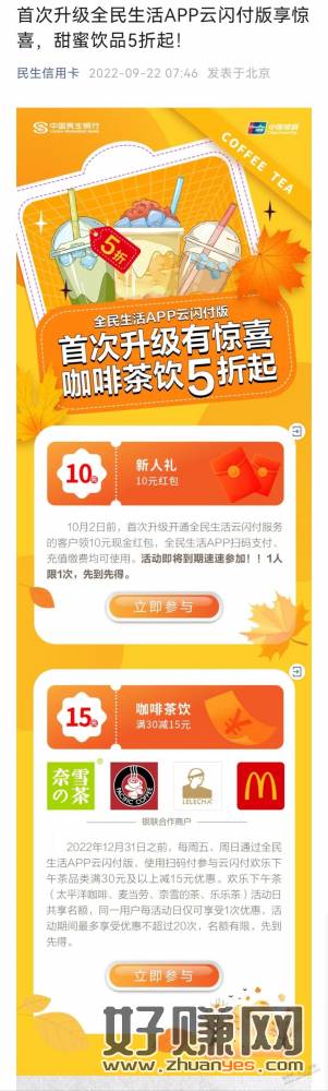 每周五、周日全民生活APP云闪付版,使用扫码付满30-15,共享20次优惠,300元大毛!