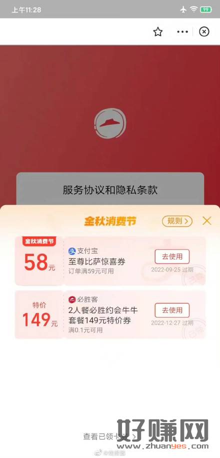 支付宝搜必胜客,如图59-58券,没有不要领,反复进几次,不过进多了则没次数了