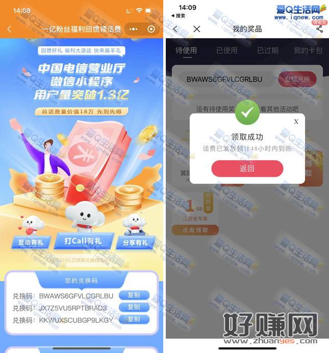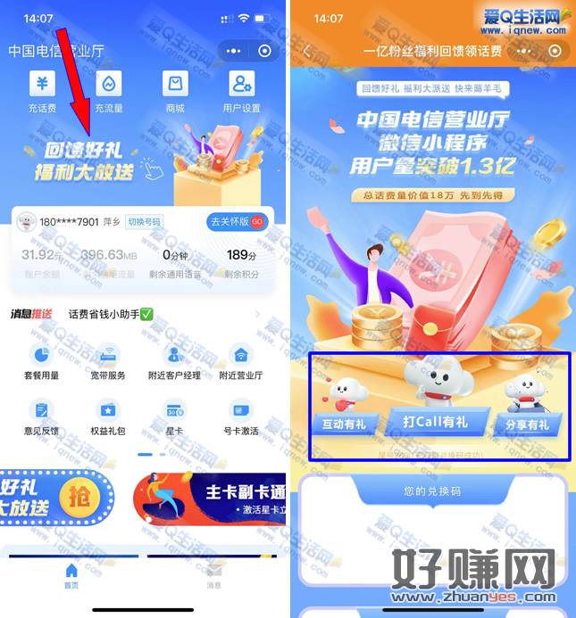 微信小程序搜索【中国电信营业厅】-点击首页横幅【回馈好礼福利大放送】进入-去互动,打CALL、分享页面都可获得一个兑换码,一个兑换码就是1元话费