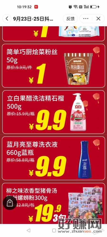 里面有9.9一瓶的蓝月亮至尊浓缩洗衣液。每个抖音号限购6瓶。凑点点其他的满88可以免运费(不够88的好像是7元)