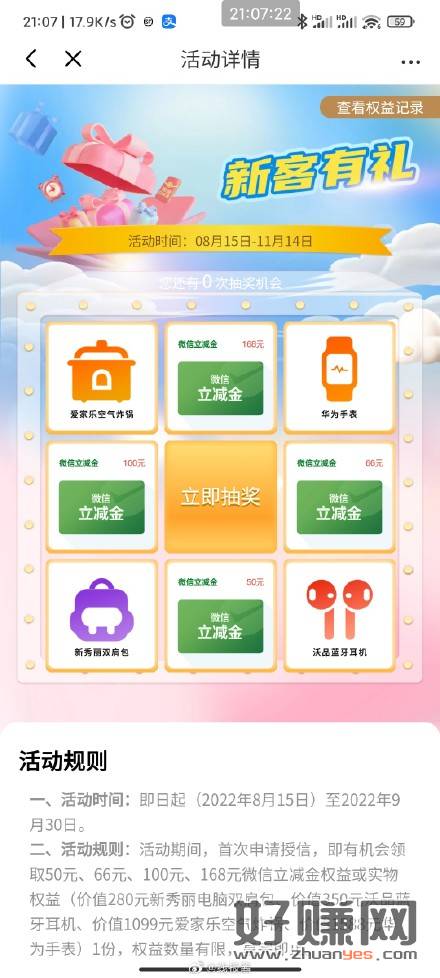 光大银行app,生活,权益服务,有个光速贷新客权益,抽奖