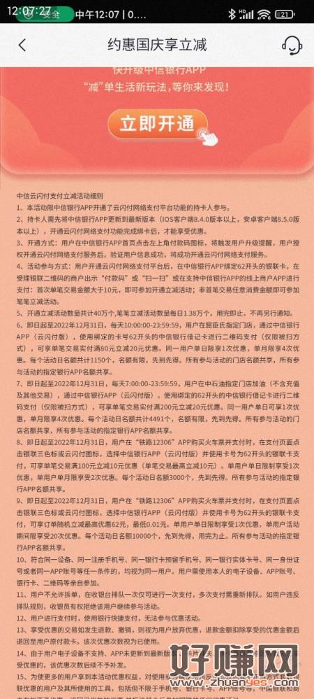 开通方式:用户在中信银行APP首页点击左上角付款码图标,将触发用户升级提醒,用户授 权开通云闪付网络支付服务后 验证用户信息成功,将成功开通云闪付网络支付服务,具体看图