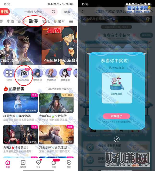 优酷APP-顶部滑动分类,选择【动漫】-中间【新片发布会】-抽中奖励在优酷APP,我的-卡券包,填写地址