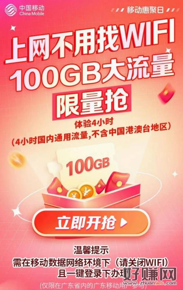 广东移动领0元100G有效4小时,用完可以继续买,连续10次!