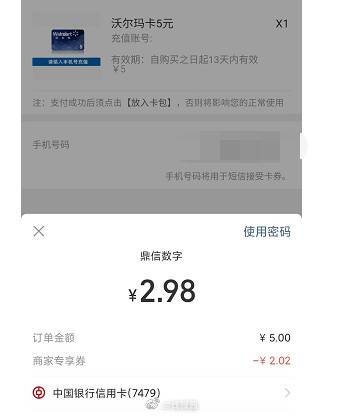 支付宝搜索鼎信充值,弹5-xx优惠劵,买5沃尔玛