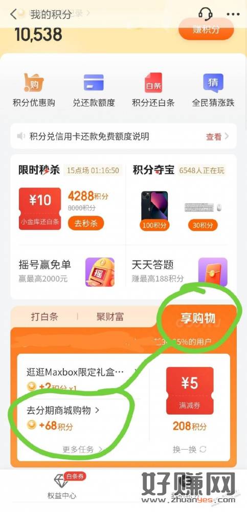 金融app…我的,对页面积分那里点击一下,进下图,把任务领了,然后分期商城买完就能有68积分。