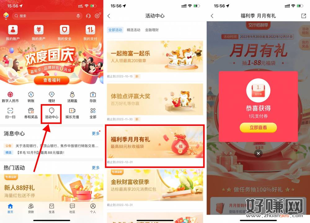 【交行福利季抽1~10元支付券】新一期!交行APP首页“活动中心”->福利季月月有礼->完成简单任务得3次机会->支付券需扫银联码才能抵扣