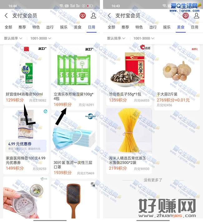 支付宝APP-我的-支付宝会员-滑动到【日用】【美食】-积分选择在1000以上 就可以看到纯积分可兑换的实物了