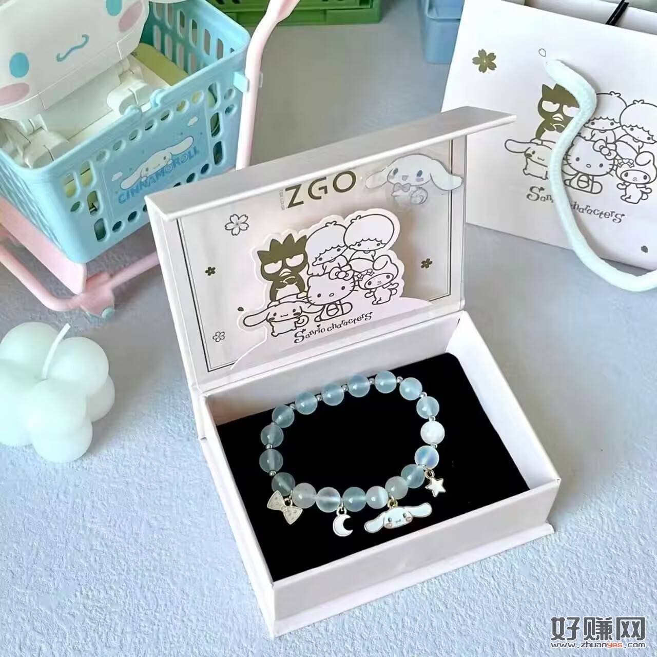 39.9潮色绘玉桂狗水晶手链礼盒珠子是蓝玉髓+荧光石+
