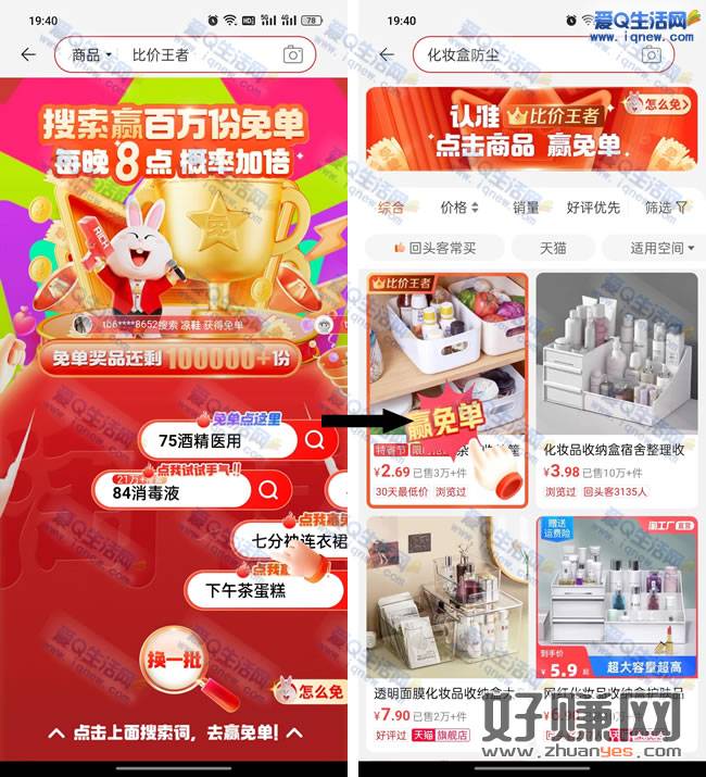 淘宝APP搜索【比价王者】点进去-点击图片上的【关键词】会自动搜索商品-点击指示出来的免单商品 打开看看是否显示0元到手 如果显示则代表获得免单资格