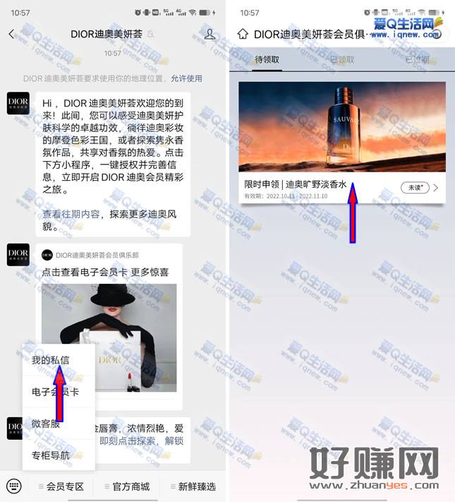 微信关注【迪奥美妍荟】公众号-菜单栏【会员专区】-我的私信-点击限时申领