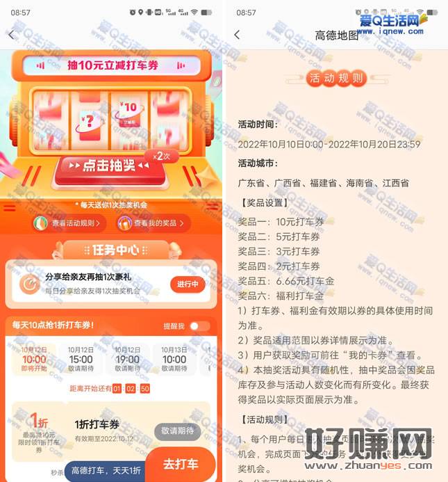 高德APP新出的活动,每天可以抽2-10元打车立减券/最高6.66元打车金