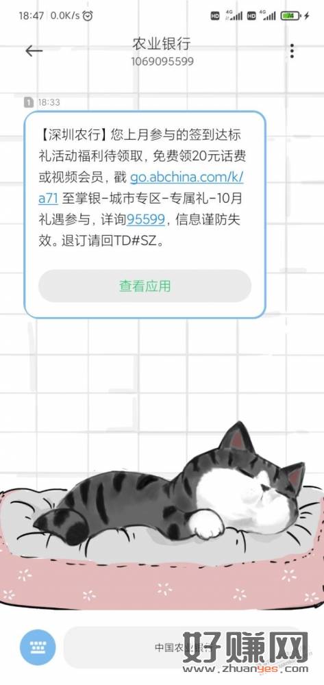 【深圳农行】您上月参与的签到达标礼活动福利待领取,免费领20元话费或视频会员,戳 go.abchina.com/k/a71 至掌银-城市专区-专属礼-10月礼遇参与,详询95599,信息谨防失效。退订请回TD#SZ。