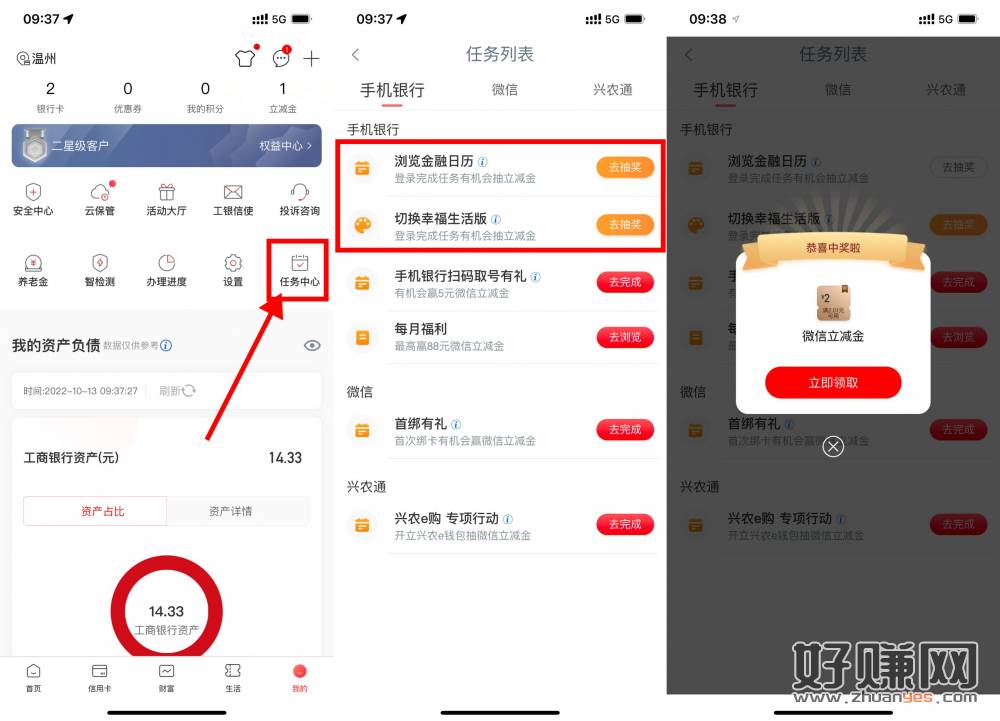 【工行象惠星期四抽4元立减金】工行APP搜索“任务中心”进入->完成“切换幸福生活版”和“浏览”任务,抽2+2元立减金(全部抽完再切换版本回去)
