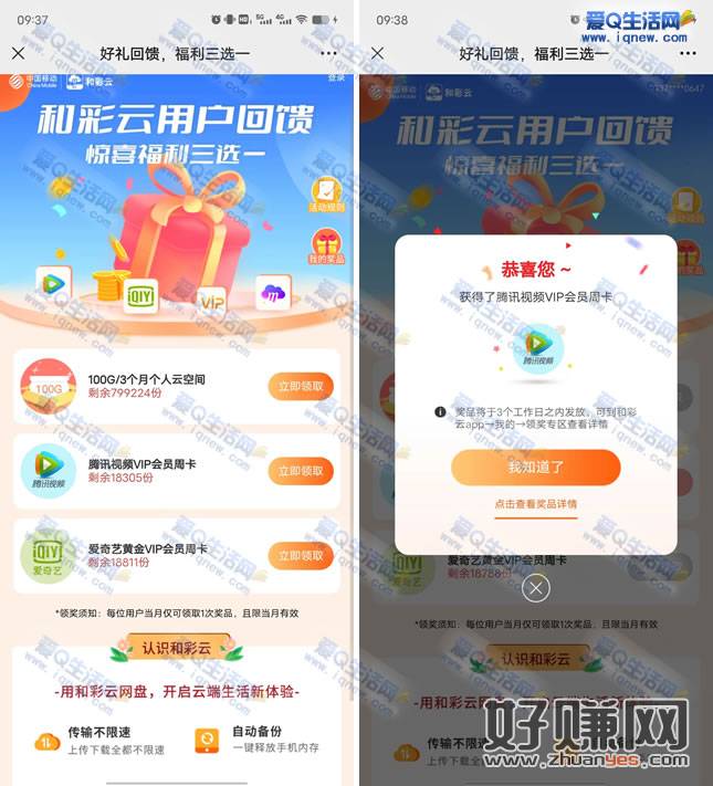 登录直接领取爱奇艺周卡/腾讯视频周卡/100G个人云空间3个月,奖励三选一