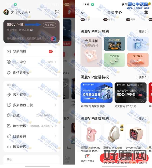 1.网易云APP-首页-左上角头像-会员中心-【黑胶VIP生活福利】