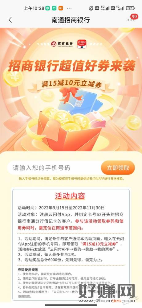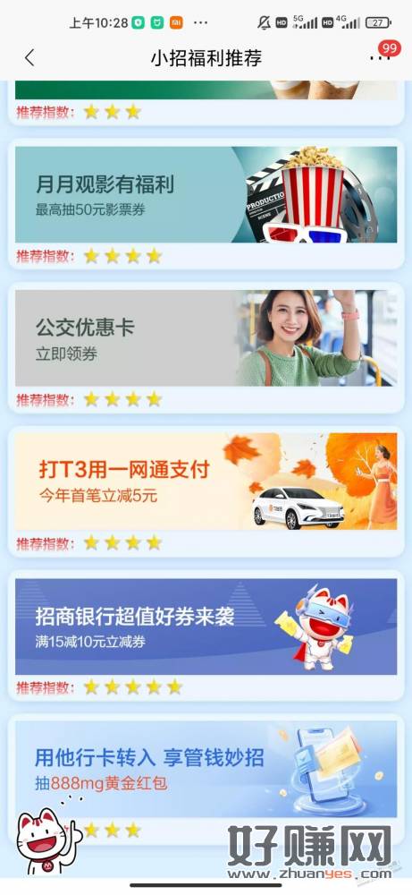 右上角消息里,小招福利推荐,或“招行南通分行”服务号最新推送,热门活动/精选福利里找找