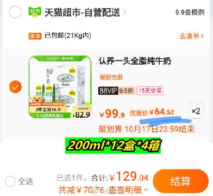 认养一头牛全脂纯牛奶200ml*12盒*4箱!!129