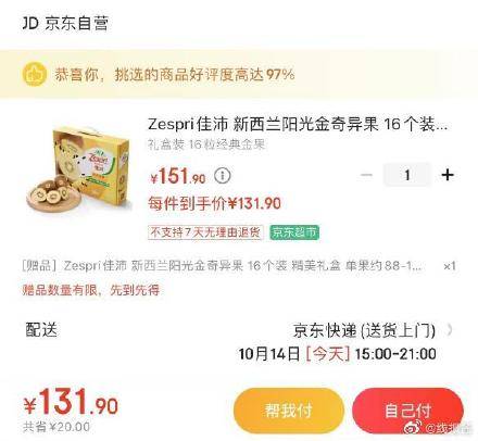 领页面生鲜119-20券 佳沛阳光金奇异果 16个装 买一赠