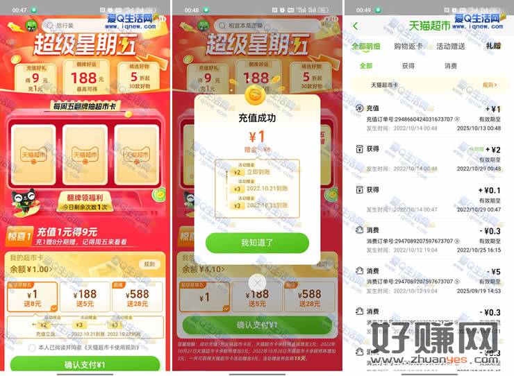 剩下的6元猫超卡,10月21日到账3元,10月28日到账3元