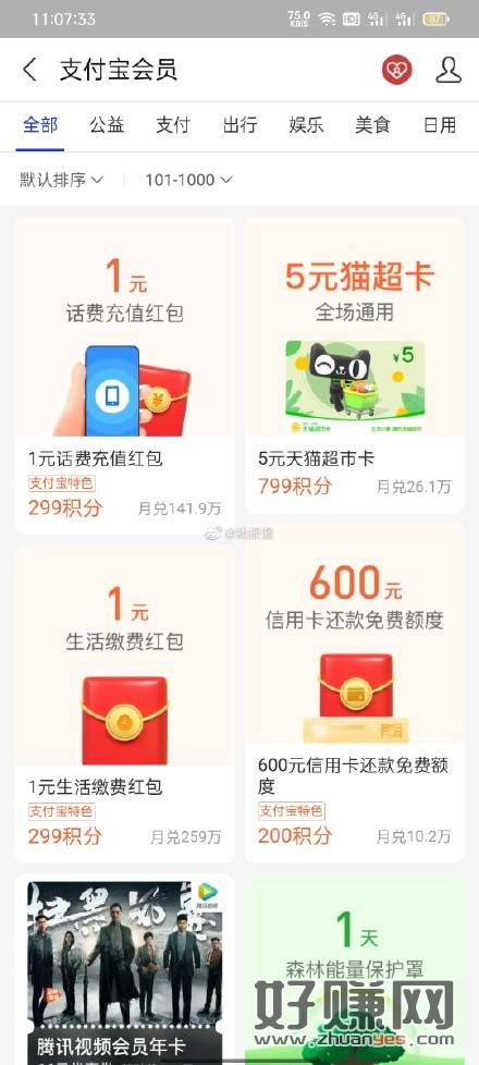 支付宝会员中心,799积分又可以换5天猫超市卡了