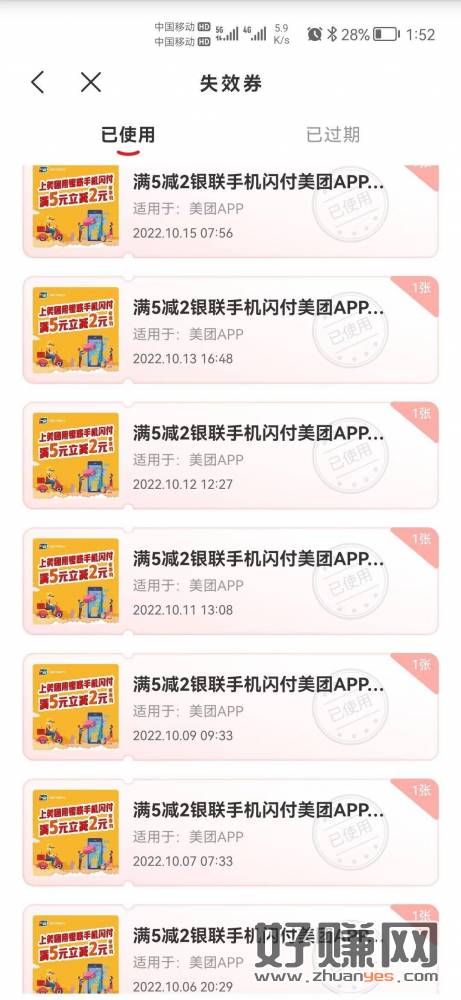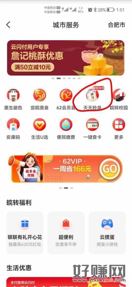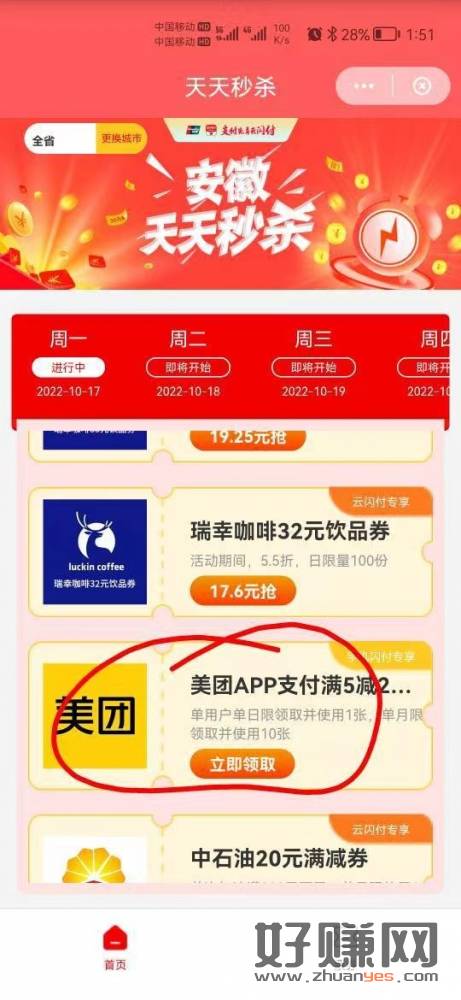 云闪付安徽,首页城市服务,进去后天天秒杀,有美团5-2立减券,一个月可领10张,