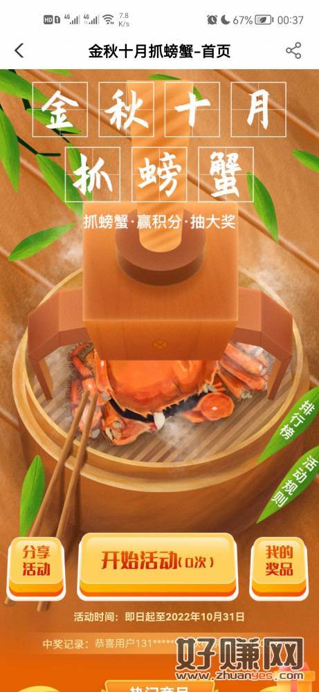 农行小豆乐园,精选活动,十月抓螃蟹,刚中5E卡