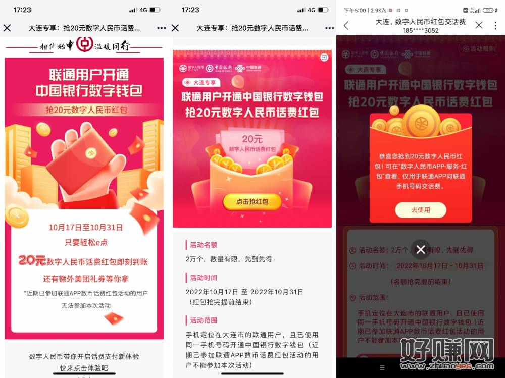 联通领20数币(需要改位置到大连)可用于冲话费 有需求的去即