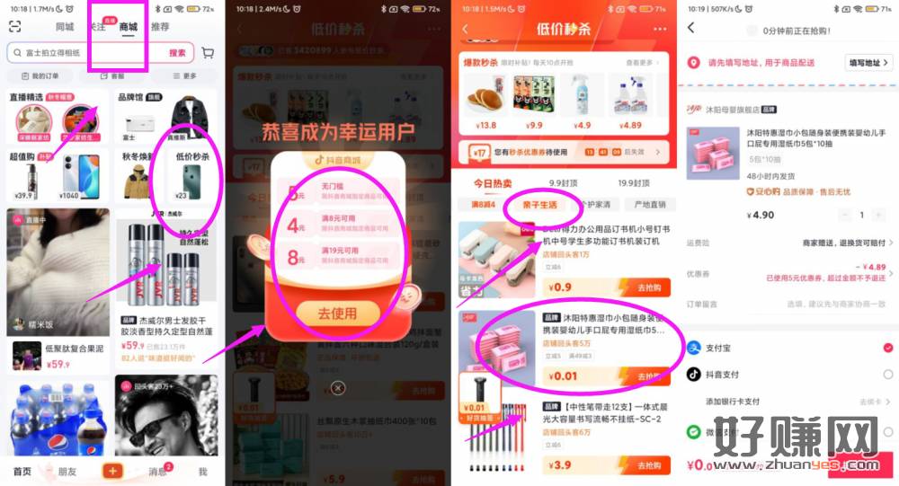 【抖音老户部分人0.01撸湿巾】打开抖音APP首页顶部“商城”->最低价秒杀->自动弹窗5元券->去使用->点击“亲子生活”找到湿巾下单即可!