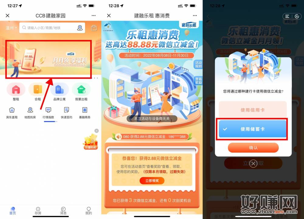 【建行每月领2.88~88.88微信立减金】新一期!建行APP搜索“建融家园”进入->首页横幅进入->抽最低2.88元立减金->每天限量8000份,如果晚点没了就次日再上!